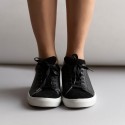 جنس MICROFIBER: چرم میکروفایبر بنسن ساختاری شبیه به الیاف کلاژن چرمی دارد و از لحاظ مقاومت هیچ تفاوتی با چرم طبیعی ندارد، فقط از لحاظ قیمت نسبت به چرم طبیعی کمی مقرون به صرفه و محافظ محیط زیست است. شفق برای جنس اسنیکرز از میکروفایبر استفاده کرده است.